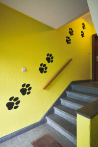 kunstundwohnen #17 Project description for the mural design in the stairwell of Lutfridstraße 12 by the artist Pia Stadtbäumer: For 2023, as part of the "kunstundwohnen" project, we were able to engage the artist Pia Stadtbäumer, who chose the stairwell at Lutfridstraße 12 to implement her work, installing her colorful mural "Cat's Out" as a supplement to 2023. The artistic work was completed in late summer 2024. When Pia Stadtbäumer began studying at the Düsseldorf Art Academy in the early 1980s, the figurative was almost a silent desire – alongside the important discourse of conceptual art, the "Neue Wilden" (New Wild) were reconquering expressive painting with garish gestures. But even beyond these currents, something was stirring: a new view of the body, as a bearer of history, as a measure of perception, as a site of resistance. Artists such as Kiki Smith, Robert Gober, Stephan Balkenhol, and Martin Honert embraced this approach – and Pia Stadtbäumer did it her way. Her early sculptures – corporeal fragments, bathed in vibrant colors, formed from materials such as wax, paper, or felt – seemed as if they came from an in-between world. In 1990, as part of the Peter Mertes Fellowship, the Bonner Kunstverein showed these modeled, oversized blue arms, which seemed simultaneously alien and familiar. Further grants followed, including the Schmidt-Rottluff Fellowship and the Kunstfonds (Art Fund), recognitions that also serve as milestones. Since 2000, she has taught as a professor at the HFBK Hamburg – a sculptor who reimagines spaces and re-examines bodies within them. Stadtbäumer's works are idiosyncratic: they seem close to the familiar yet simultaneously elude it. Realistically modeled, yet with unsettling proportions—oversized or fragmented, made of wax or felt—limbs hang from the ceiling, bodies tip out of alignment, expectations shift. Her sculptures stimulate the familiar until it tips: into wonder, into strangeness, into questioning. She opens up, refracts, elaborates, and translates the classical sculptural element—the body, the fragment, the material—into the present. Just as Giacometti once inscribed a new temporality on the human figure, Stadtbäumer creates a unique language for the 21st century. Pia Stadtbäumer also knows how to anchor her narratives in the interior. For MIWO's "kunstundwohnen" series, she transformed the stairwell at Lutfridstraße 12 into a fabulous setting. In "Cat's Out!" a silent story unfolds, evoking an entire cosmos in a few, comic-like, pointed symbols and bold areas of color. A cat sneaks up the stairs. Tip, tap, tip, tap – only their paw prints betray them: black on yellow, from the entrance to the raised ground floor. Then: a deep midnight blue. Two enormous cat eyes glow from the wall. One floor up: a cat's snout with whiskers like threads stretching into the unknown. Bird tracks follow, ascending: first white on blue, then black on yellow. Step by step – until at the top only the cat's tail disappears into the wall. Thus, everyone who enters this building becomes part of the narrative. Unwittingly, the path through the stairwell becomes a choreography, a search for clues, a small stage. With a few, carefully placed signs, Pia Stadtbäumer succeeds in transforming a space – into a story without a beginning or an end. A story that remains in motion – like her sculptures themselves. Text: Beate Eckstein / Pia Stadtbäumer Photographer: (Mareike Tocha, Cologne)